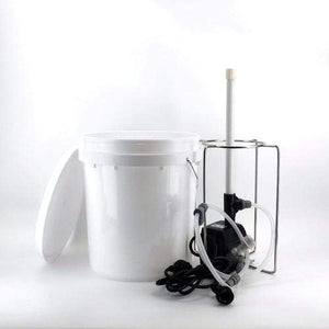 The Bucket Blaster includes a 2,000 liter/hour pump (528 gallons/hour), 15L (3.96 gallon) bucket, a powerful jet nozzle, 9.5mm OD EVABarrier tubing, a duotight tee piece, a gray and black ball lock disconnect, and the stainless stand.