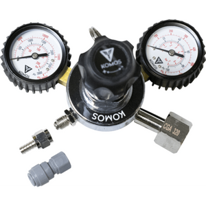 The KOMOS Dual Gauge CO2 Regulator is a beefy, industrial-grade regulator that provides consistent, worry-free performance. The robust body and precision diaphragm provide high flow rates, and the pressure can be easily and precisely adjusted with the hand dial. Extra thick stainless gauges come with rubber bumpers for added protection. The dial faces are triple-scaled to read in psi, bar, and kPa.